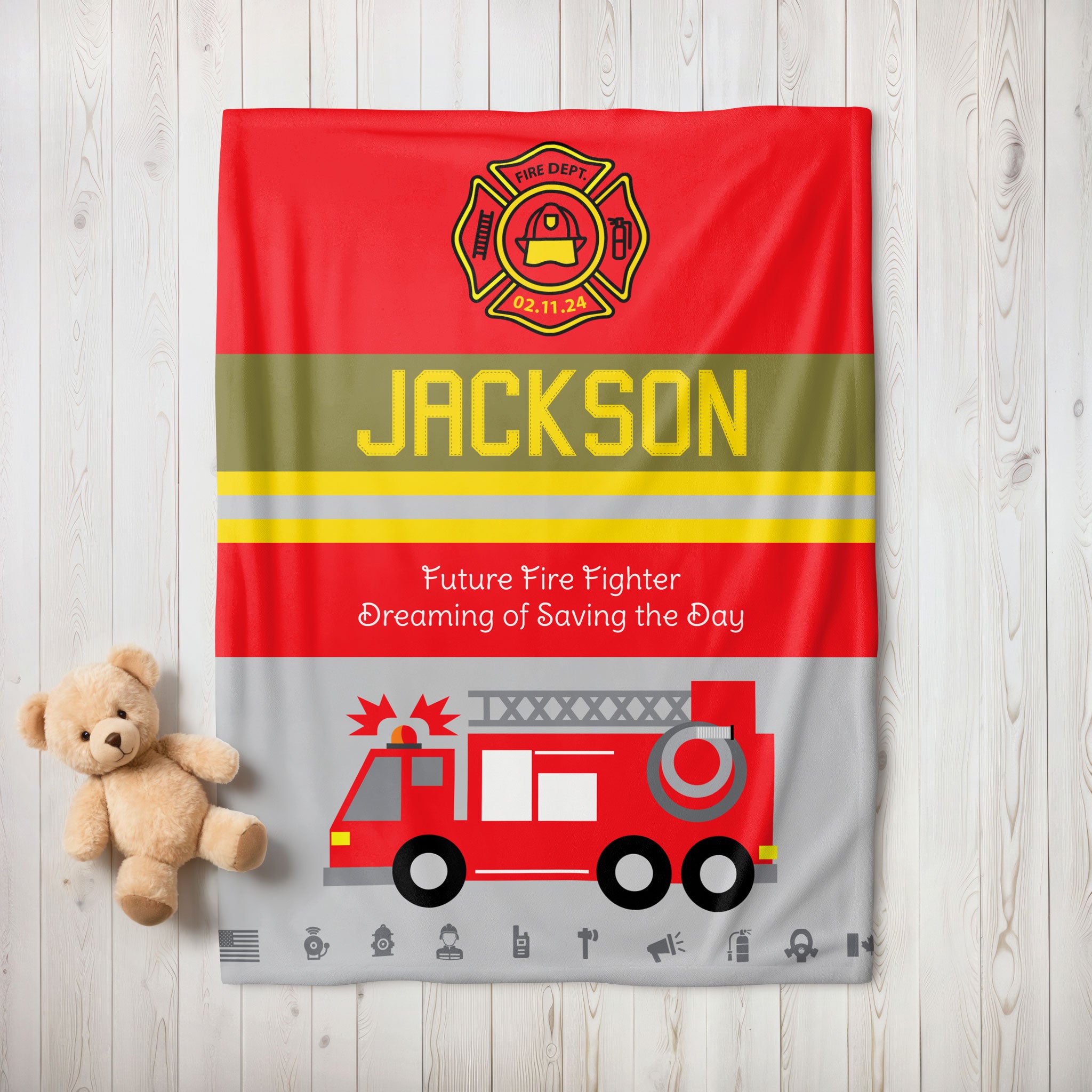 The name on the blanket is just like how names look on the back of fire jackets. It's a pretty thoughtful design with how they also put our son's birthday into the top crest. Pretty cool idea for a baby blanket.